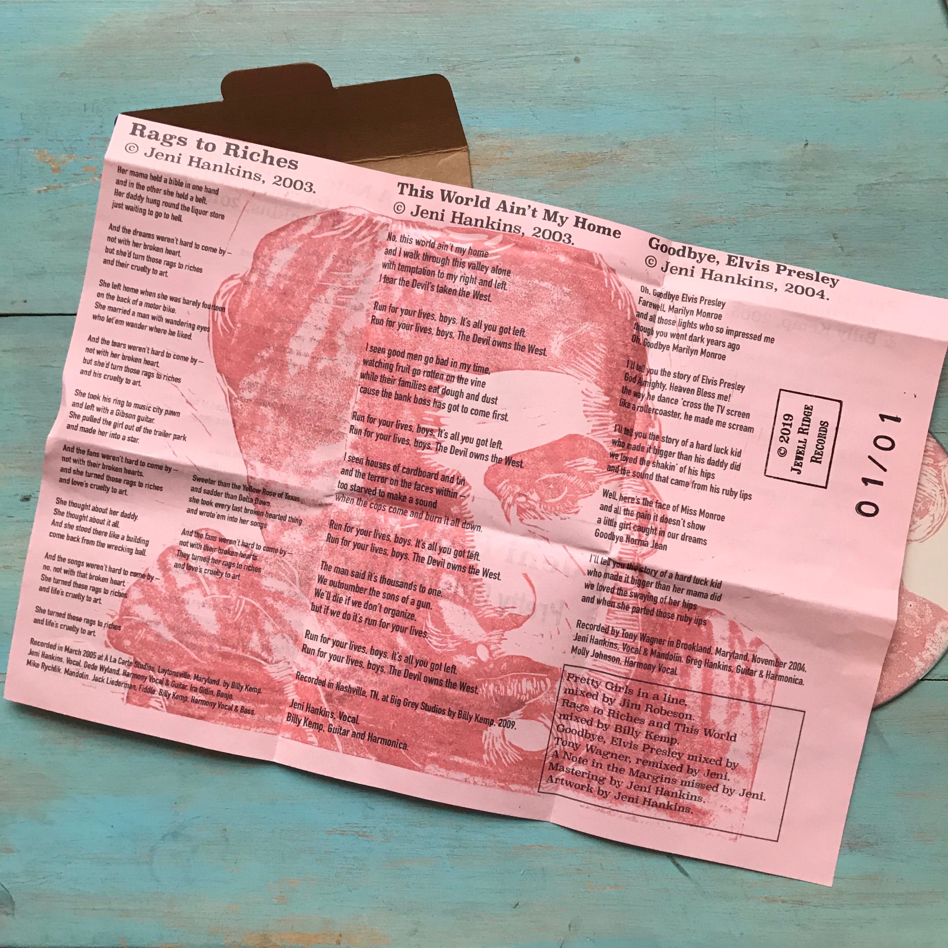 Back in 2019 when I released my Homecoming Queen CD, a fan asked me if I could create an ultimate superfan package for him because he and his daugher loved my music so much! Wow. Thank you! One of the things that I made for them was a five song EP called Pretty Girls in a Line. “Goodbye, Elvis Presley” was track five. My fan and his daughter were happy with their superfan package. I appreciated the support for my music and I finally got to use the linocuts of Elvis and Marilyn I’d made back in 2004 when I wrote this song. Marilyn made the cover of the CD envelope and Elvis adorned the lyric sheet.